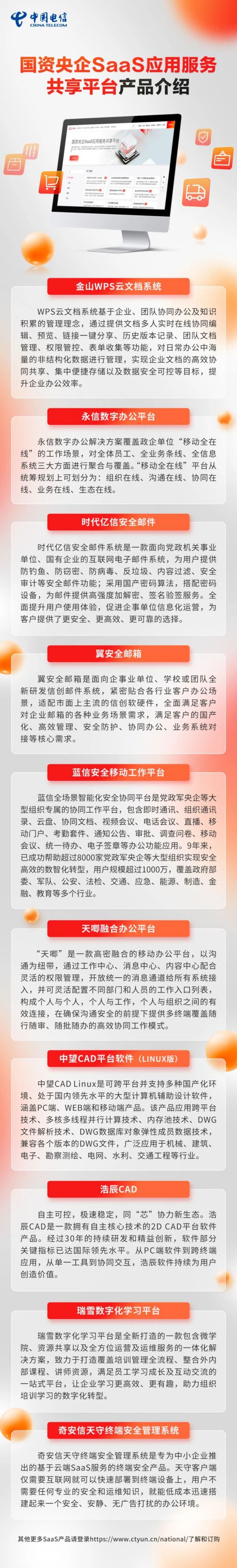 在國(guó)資委指導(dǎo)下,中國(guó)電信建設(shè)了“國(guó)資央企SaaS應(yīng)用服務(wù)共享平臺(tái)”,服務(wù)國(guó)資央企信息化建設(shè)模式創(chuàng)新、安全保障能力提升和軟件正版化等工作協(xié)同推進(jìn)。平臺(tái)以中國(guó)電信天翼云為底座,已完成流式辦公軟件、專業(yè)軟件、安全移動(dòng)工作平臺(tái)等20余款基礎(chǔ)通用類軟件SaaS化部署,為國(guó)資央企提供高效、安全的一站式應(yīng)用上云服務(wù),構(gòu)建安全體系新格局。