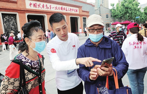 6月3日,位于上海市的中國共產(chǎn)黨第一次全國代表大會紀(jì)念館全新開放。中國電信上海公司派出了30多位黨團(tuán)員,前往“一大”紀(jì)念館提供館內(nèi)講解及館外維護(hù)等志愿服務(wù)。圖為電信志愿者協(xié)助老人在手機(jī)上預(yù)約參觀券。