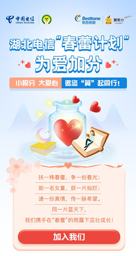 2021年7月15日,由號百控股股份有限公司、中國電信湖北公司攜手中國兒童少年基金會發(fā)起“春蕾計劃”為愛加分行動,湖北電信“春蕾計劃”積分公益捐贈活動正式上線,湖北地區(qū)的電信用戶可以委托中國電信湖北公司、號百控股股份有限公司捐出自己的電信積分,不設最低捐贈額度(1積分起),充分發(fā)揮“小積分 大愛心”1分也是愛的愛心力量,助力湖北困難地區(qū)女童實現(xiàn)教育、就業(yè)的夢想。