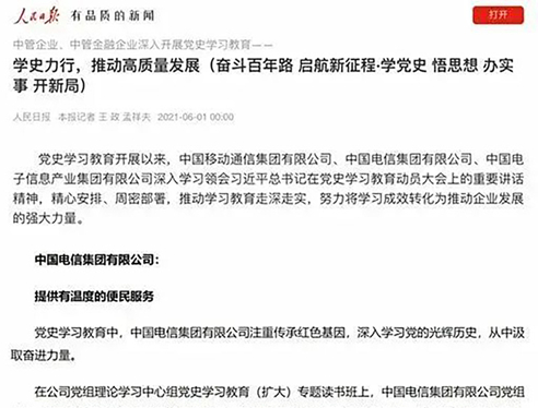 《人民日?qǐng)?bào)》報(bào)道中國(guó)電信深入開(kāi)展黨史學(xué)習(xí)教育