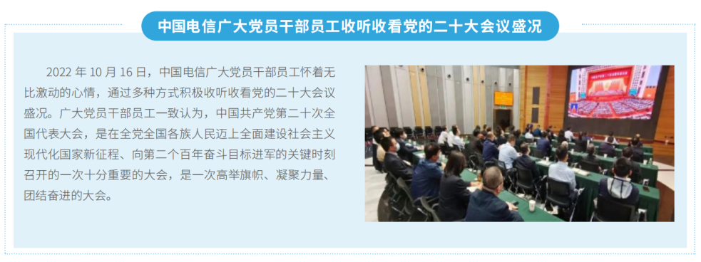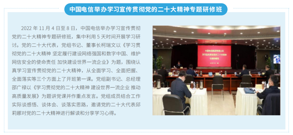 黨的二十大開(kāi)幕當(dāng)天,中國(guó)電信組織全集團(tuán)黨員干部員工通過(guò)多種方式積極收聽(tīng)收看黨的二十大會(huì)議盛況。黨的二十大召開(kāi)后,公司黨組第一時(shí)間對(duì)全集團(tuán)學(xué)習(xí)宣傳貫徹黨的二十大精神工作作出全面安排部署,迅速掀起學(xué)習(xí)宣傳貫徹?zé)岢薄9军h組先后11次開(kāi)展專(zhuān)題學(xué)習(xí)研討,原原本本、逐字逐句地研讀黨的二十大報(bào)告和黨章以及有關(guān)決議文件,分享體會(huì)、交流收獲。公司黨組成員帶頭深入分管條線、所在黨支部和黨建聯(lián)系點(diǎn)講黨課、作宣講,以上率下引導(dǎo)黨員干部全面學(xué)習(xí)、全面把握、全面落實(shí)黨的二十大精神。舉辦專(zhuān)題研修班和線上學(xué)習(xí)專(zhuān)題班等,抓好領(lǐng)導(dǎo)干部集中輪訓(xùn),開(kāi)展全員培訓(xùn)。創(chuàng)新宣傳宣講方式,開(kāi)辟學(xué)習(xí)宣傳黨的二十大精神專(zhuān)題專(zhuān)欄,深入宣傳各級(jí)黨組織學(xué)習(xí)貫徹黨的二十大精神的新實(shí)踐、新成效、新經(jīng)驗(yàn)、新風(fēng)貌。靈活運(yùn)用“網(wǎng)絡(luò)講堂”“微宣講”等形式,開(kāi)展“萬(wàn)名書(shū)記講黨課”活動(dòng),邀請(qǐng)黨的二十大代表柯瑞文、邱莉娜和專(zhuān)家學(xué)者宣講,推動(dòng)黨的二十大精神直達(dá)基層、直通一線、走進(jìn)員工。