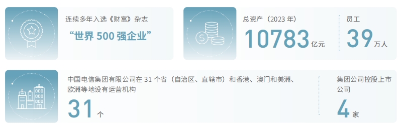 中國電信集團(tuán)有限公司是中國特大型通信運(yùn)營企業(yè),連續(xù)多年入選《財(cái)富》雜志“世界 500 強(qiáng)企業(yè)”,主要經(jīng)營移動(dòng)通信、互聯(lián)網(wǎng)接入及應(yīng)用、固定電話、衛(wèi)星通信、ICT 集成等綜合信息服務(wù)。集團(tuán)公司總資產(chǎn) 10,783 億元,員工 39 萬人。