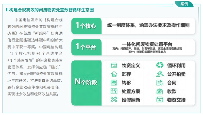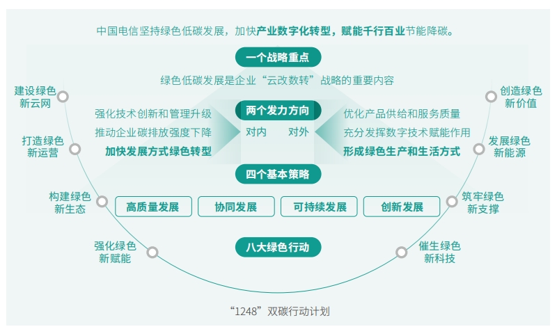 中國電信以“1248”雙碳行動計劃為指引,推進綠色云網、綠色用能、綠色辦公、循環(huán)利用、綠色科創(chuàng)和綠色管理等領域工作,不斷挖掘自身降碳潛能。