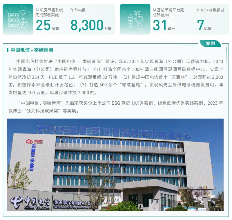 持續(xù)推進 AI 節(jié)能,自主研發(fā)智慧 AI 節(jié)能系統(tǒng),實現(xiàn)對 4/5G 基站、通信機房和數(shù)據(jù)中心的精準節(jié)能。AI 機房節(jié)能系統(tǒng)在 25 省份完成部署實施,年節(jié)電量 8,300 萬度;AI 基站節(jié)能平臺完成 31 省份部署推廣,年化節(jié)電量超過 7 億度。通過智慧 AI 節(jié)能系統(tǒng)部署,年化減少溫室氣體排放超過 44 萬噸。
